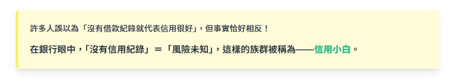 銀行核貸時最重視「還款紀錄」與「信用分數」。但信用小白完全沒有過往資料可供參考,對銀行而言,這等同於「未知風險」。