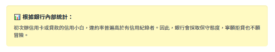初次辦信用卡或貸款的信用小白,違約率普遍高於有信用紀錄者。因此,銀行會採取保守態度,寧願拒貸也不願冒險。