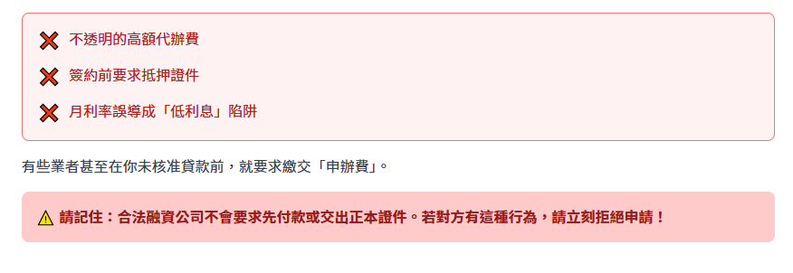 ⚠️ 請記住:合法融資公司不會要求先付款或交出正本證件。若對方有這種行為,請立刻拒絕申請!