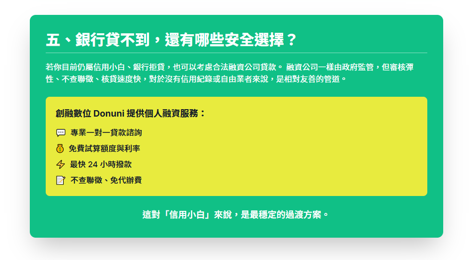 - 若銀行拒貸,還有哪些合法、安全的選擇?