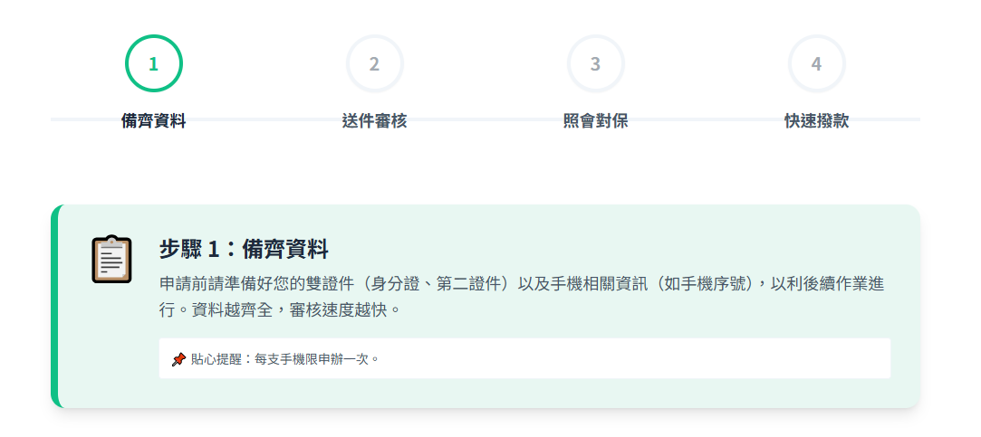 1️⃣ 備齊資料:身分證、第二證件、手機資訊(序號)