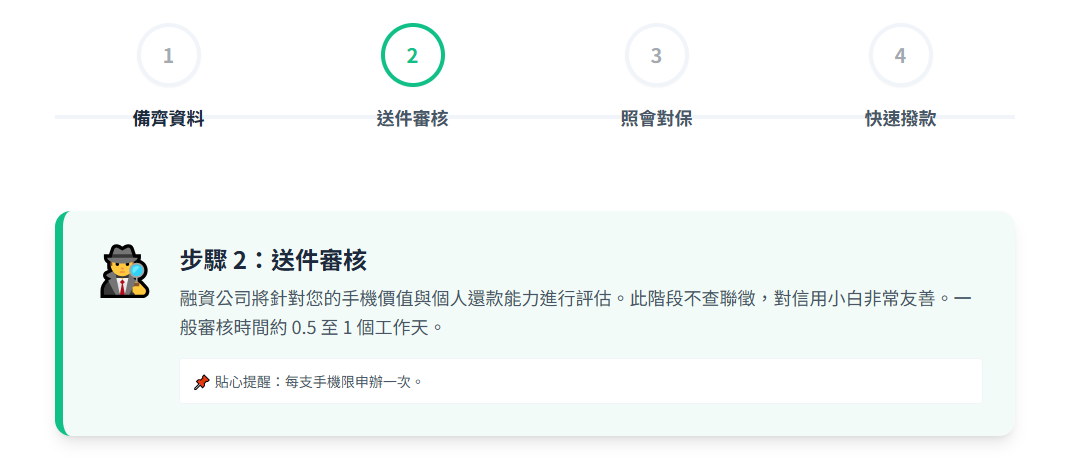 2️⃣ 送件審核:融資公司評估手機價值與個人還款能力(約 0.5~1 個工作天)