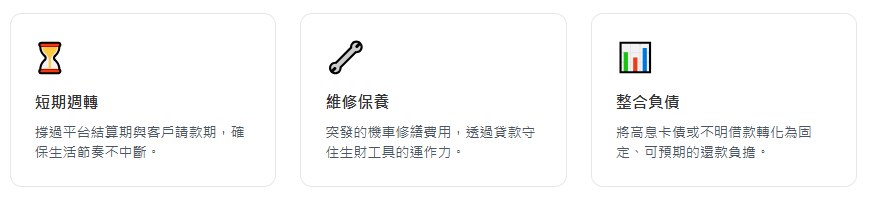 把機車貸款用得好,它會是你的「現金流緩衝墊」;用得不好,它會變成另一個壓力來源。最合理、最常見的使用方式通常有三類: