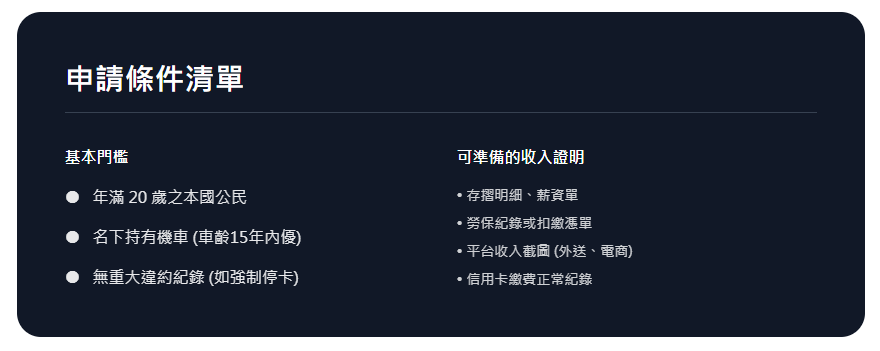 一般只要車齡15年以內皆可申請,若持有時間超過6個月以上,審核通過率更高。