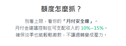 - 月付金最好落在可支配收入的 10%~15%